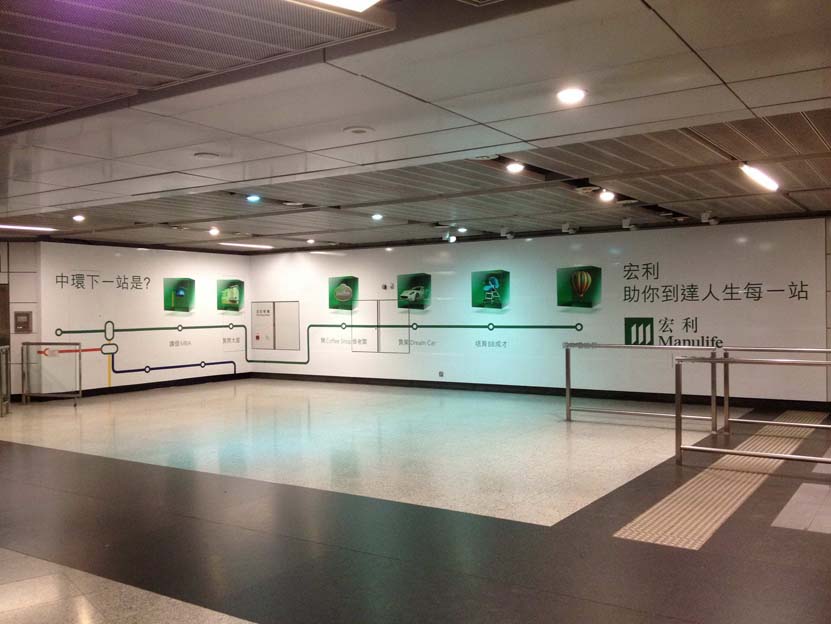 In Central, pillars at MTR platforms will be wrapped in green-and-white messages, and the TV ring zone and the concourse level near the Worldwide House exit area will be filled with Manulife cubes and branding messages.