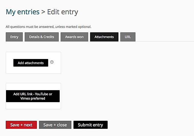 Important – If you are entering a Film category or a category that is using a case study video then click “Add Attachments” to upload a key still from the Film or Case Study video, add the entry title and then click on “Add URL Link” and upload the URL link to the Film or Case Study (YouTube or Vimeo links preferred). If you are entering a campaign then upload a key still; different entry title and a different YouTube or Vimeo link for each part of the campaign.